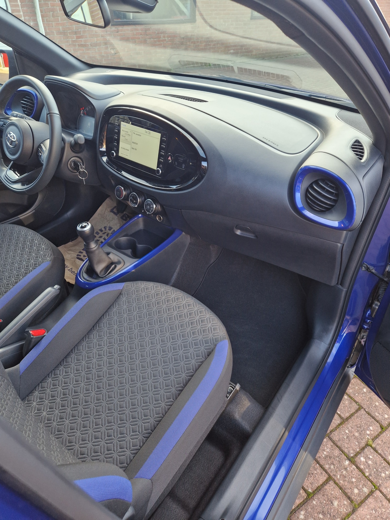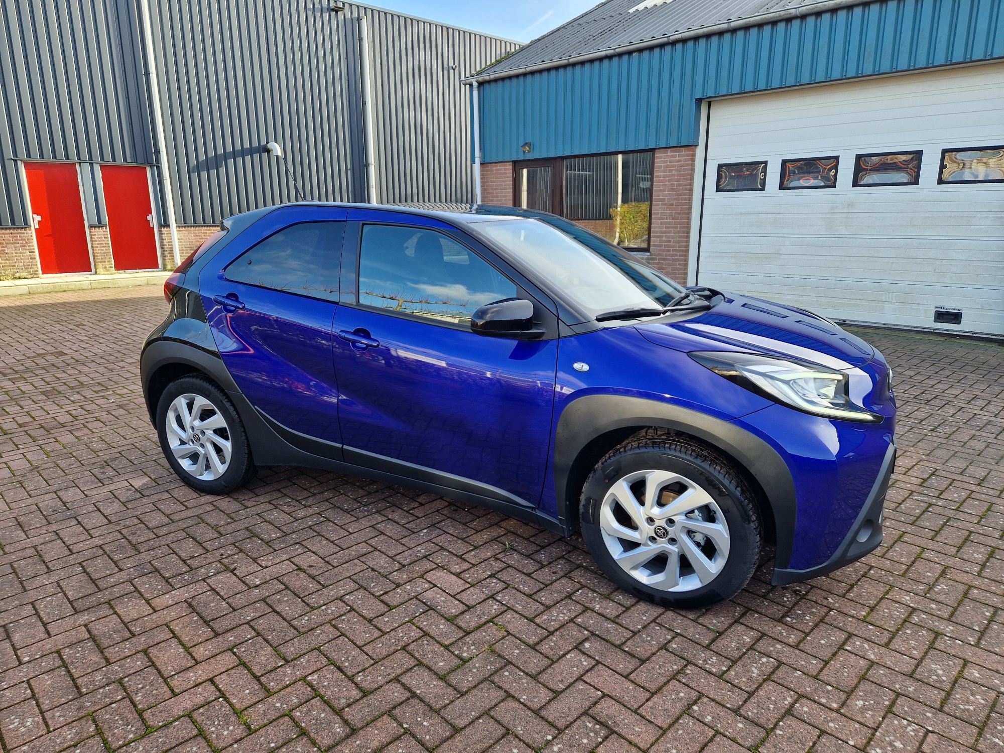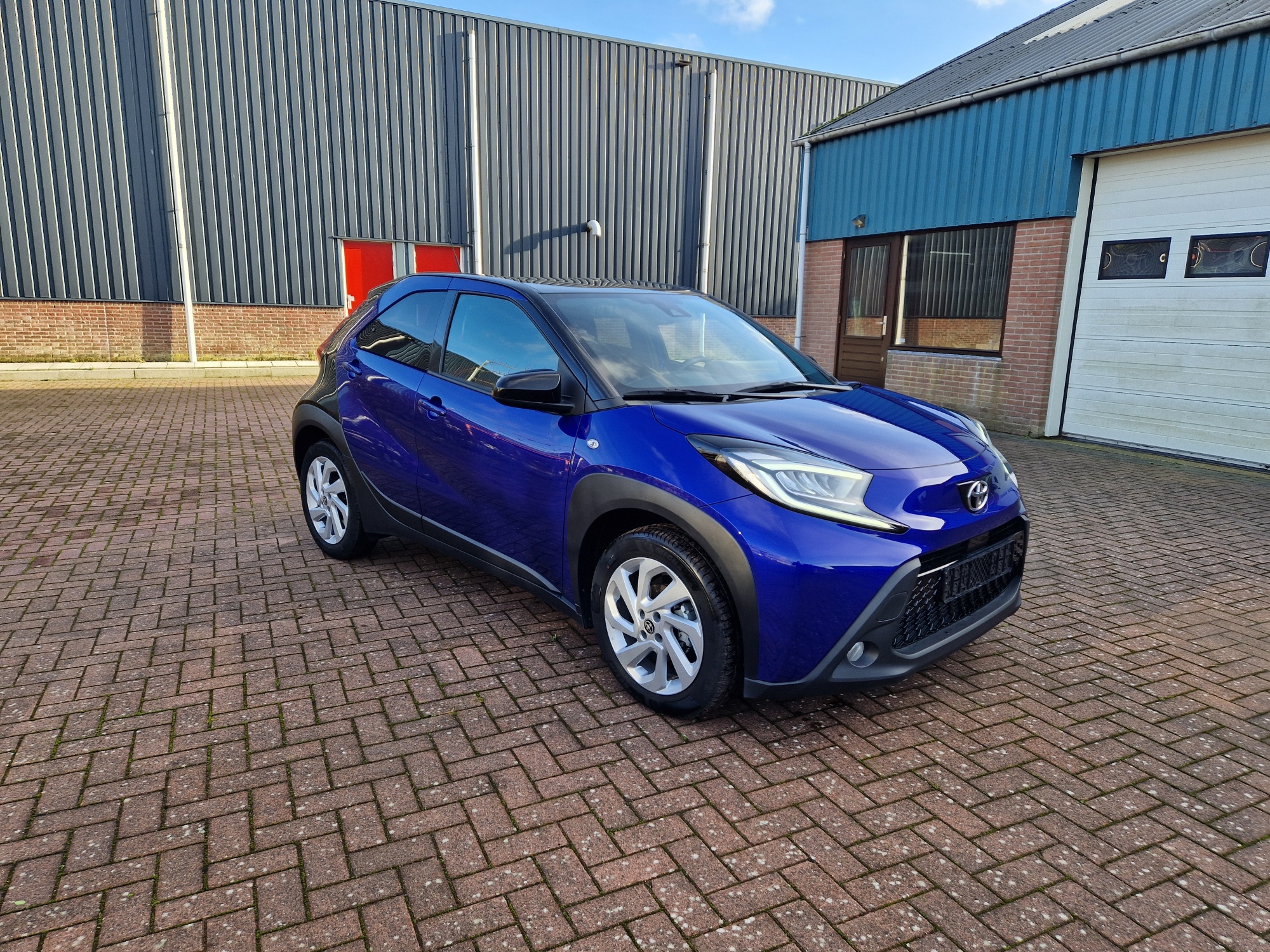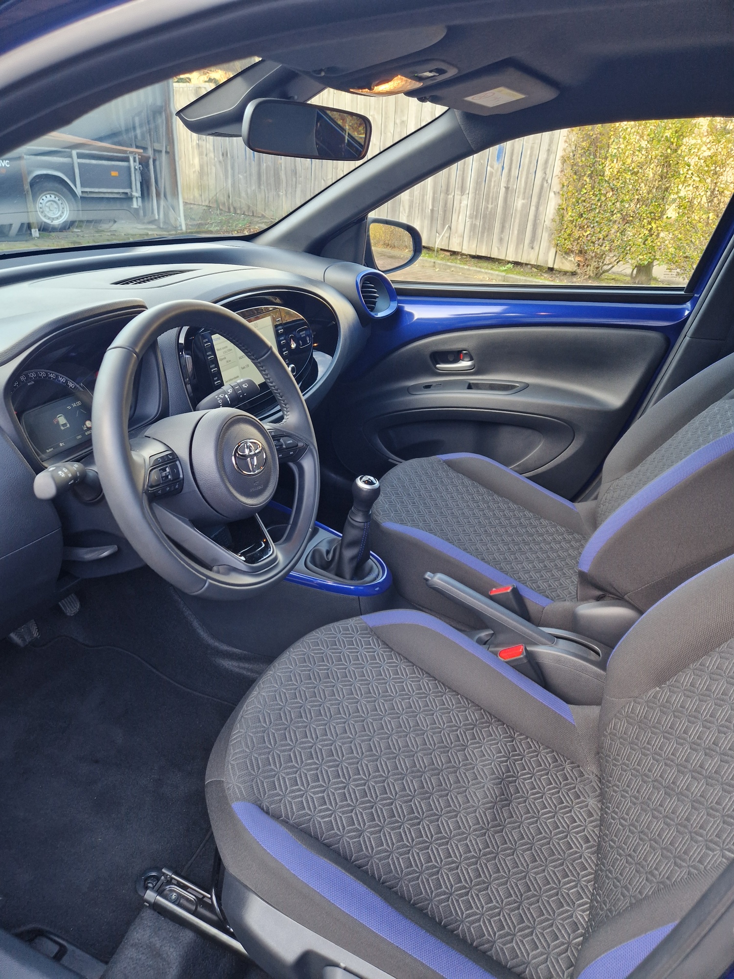 Zeer complete Aygo X Pulse. Bi-tone, Juniper Blue met zwart. Het Juniper Blue komt terug in het interieur. Mooi groot multimediascherm.