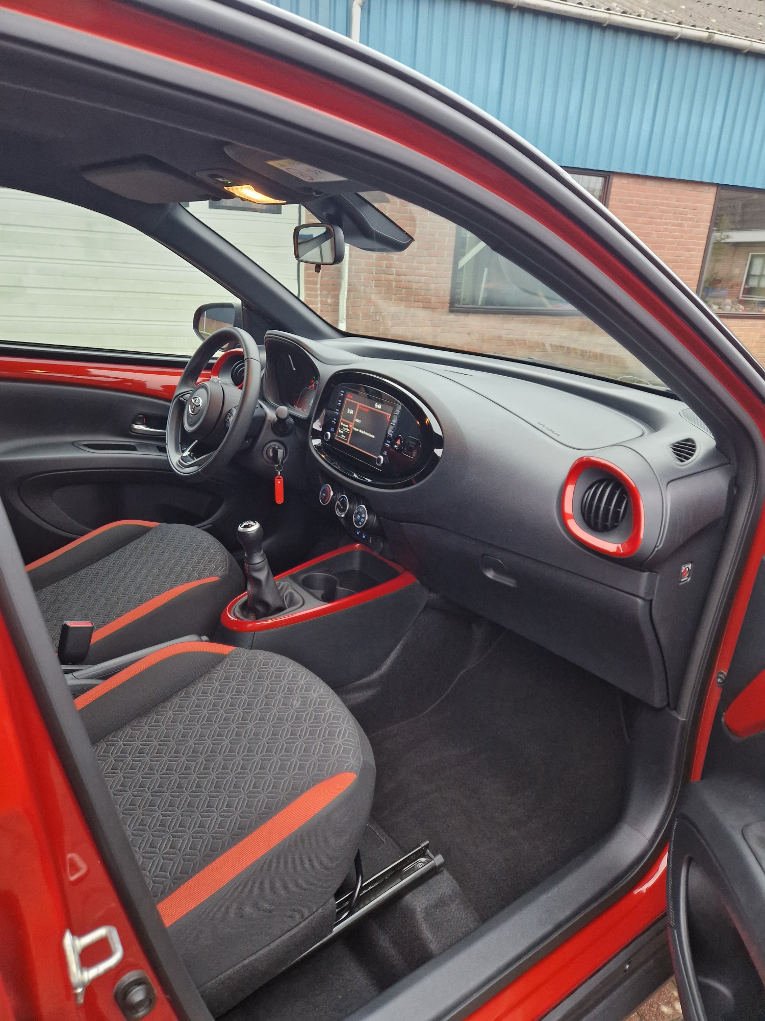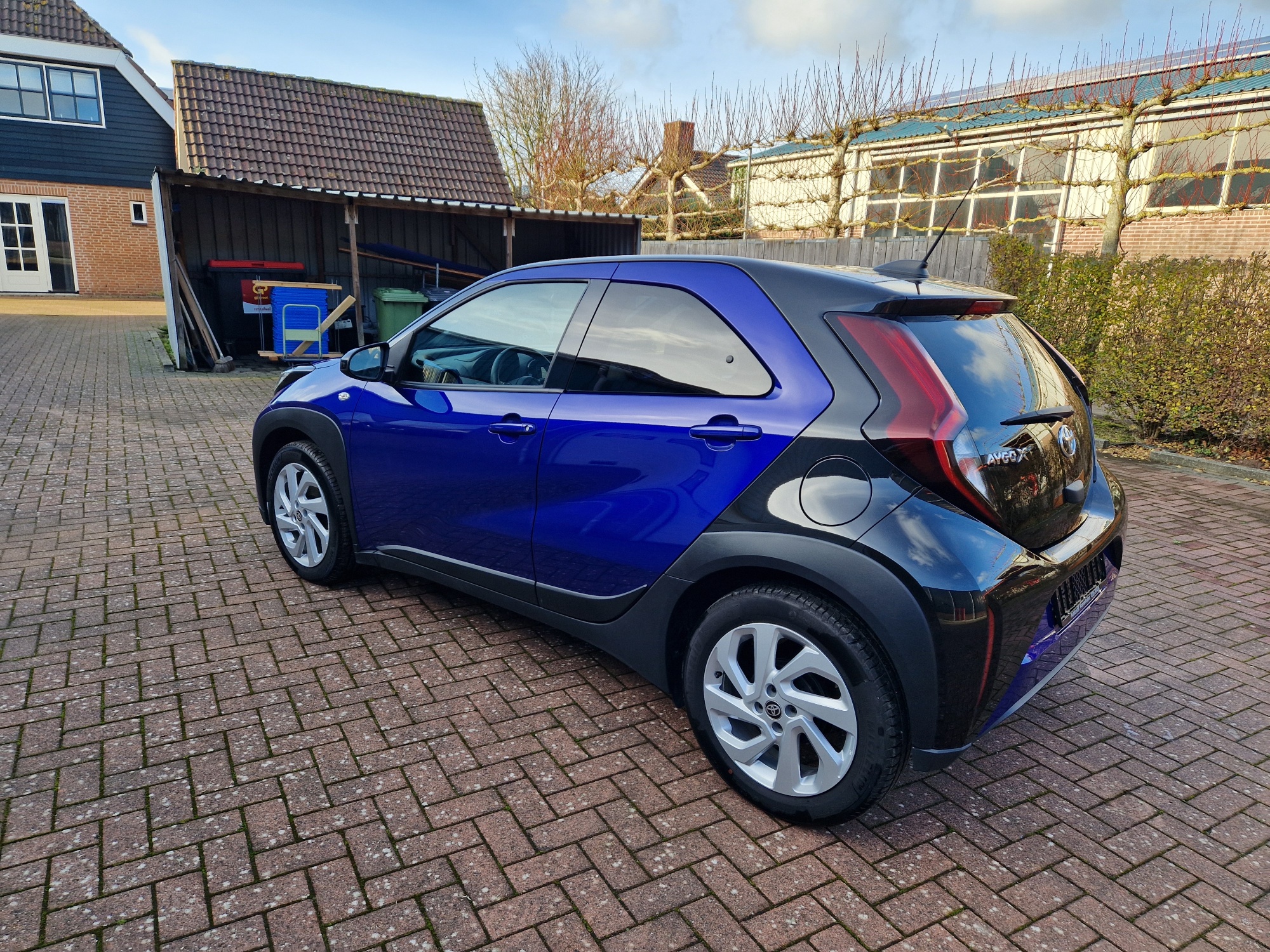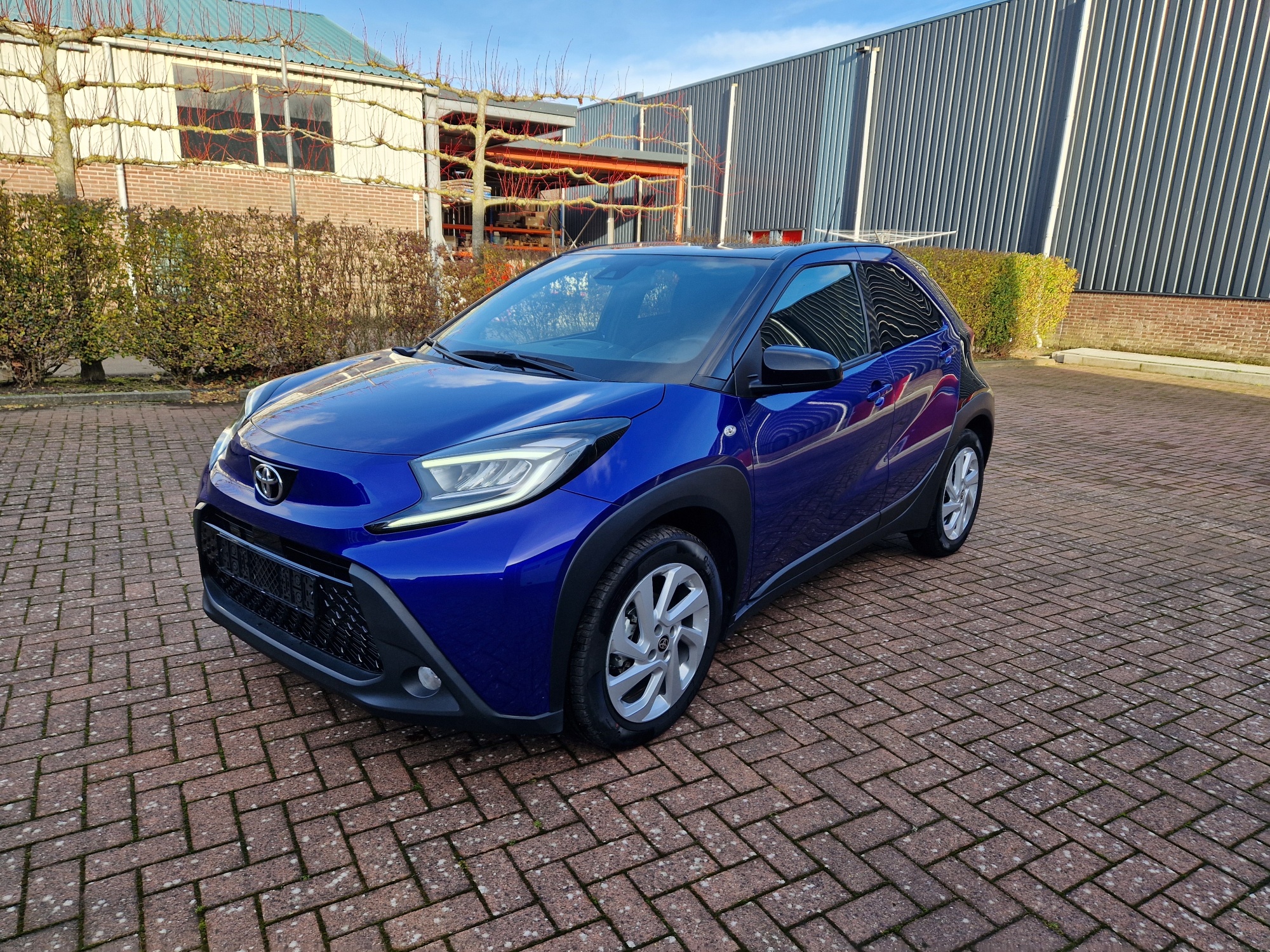 Zeer complete Aygo X Pulse. Bi-tone, Juniper Blue met zwart. Het Juniper Blue komt terug in het interieur. Mooi groot multimediascherm.